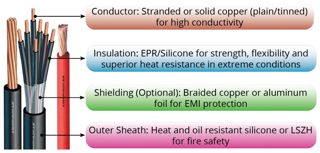 ASHIRVADCAB’s high-temperature signalling cables are designed to operate in extreme heat conditions where standard cables would degrade. These cables use special insulation materials like EPR (Ethylene Propylene Rubber) or silicone rubber, making them suitable for applications requiring heat resistance, flexibility, and durability. Due to the robust and flexible design, these cables are highly suitable for use in industries like mines, textile, wind power mills, steel mills, ships, construction machines and turbines.