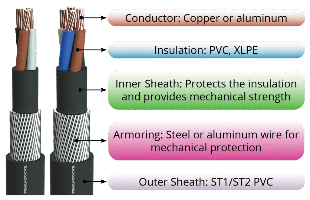 Copper or aluminium conductors along with PVC or XLPE insulation to ensure effective power transmission and safety up to 1100 V.